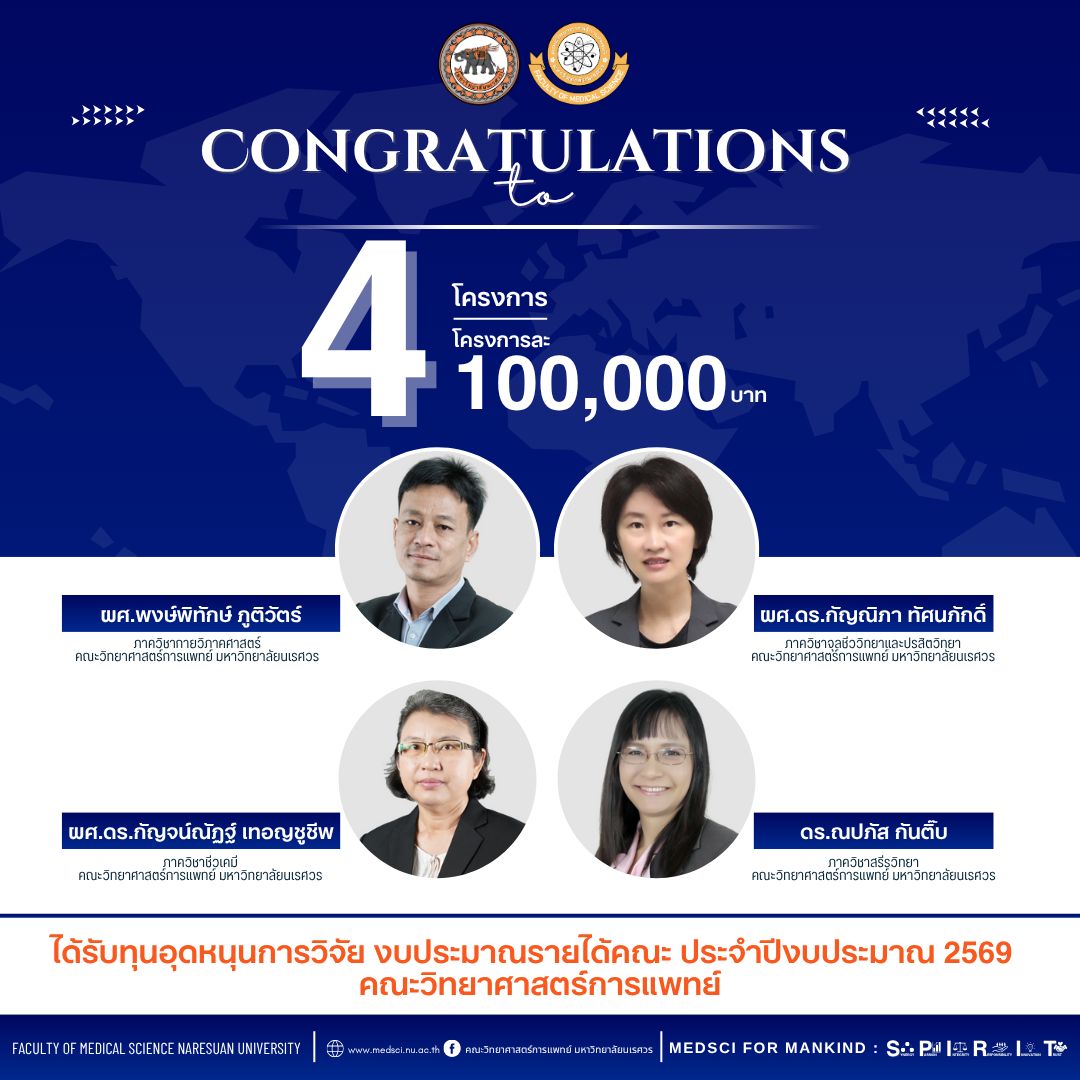 คณะวิทยาศาสตร์การแพทย์ มหาวิทยาลัยนเรศวร ขอแสดงความยินดีกับ บุคลากรสายวิชาการ ที่ได้ได้รับทุนอุดหนุนการวิจัย งบประมาณรายได้คณะ ประจำปีงบประมาณ 2569 คณะวิทยาศาสตร์การแพทย์