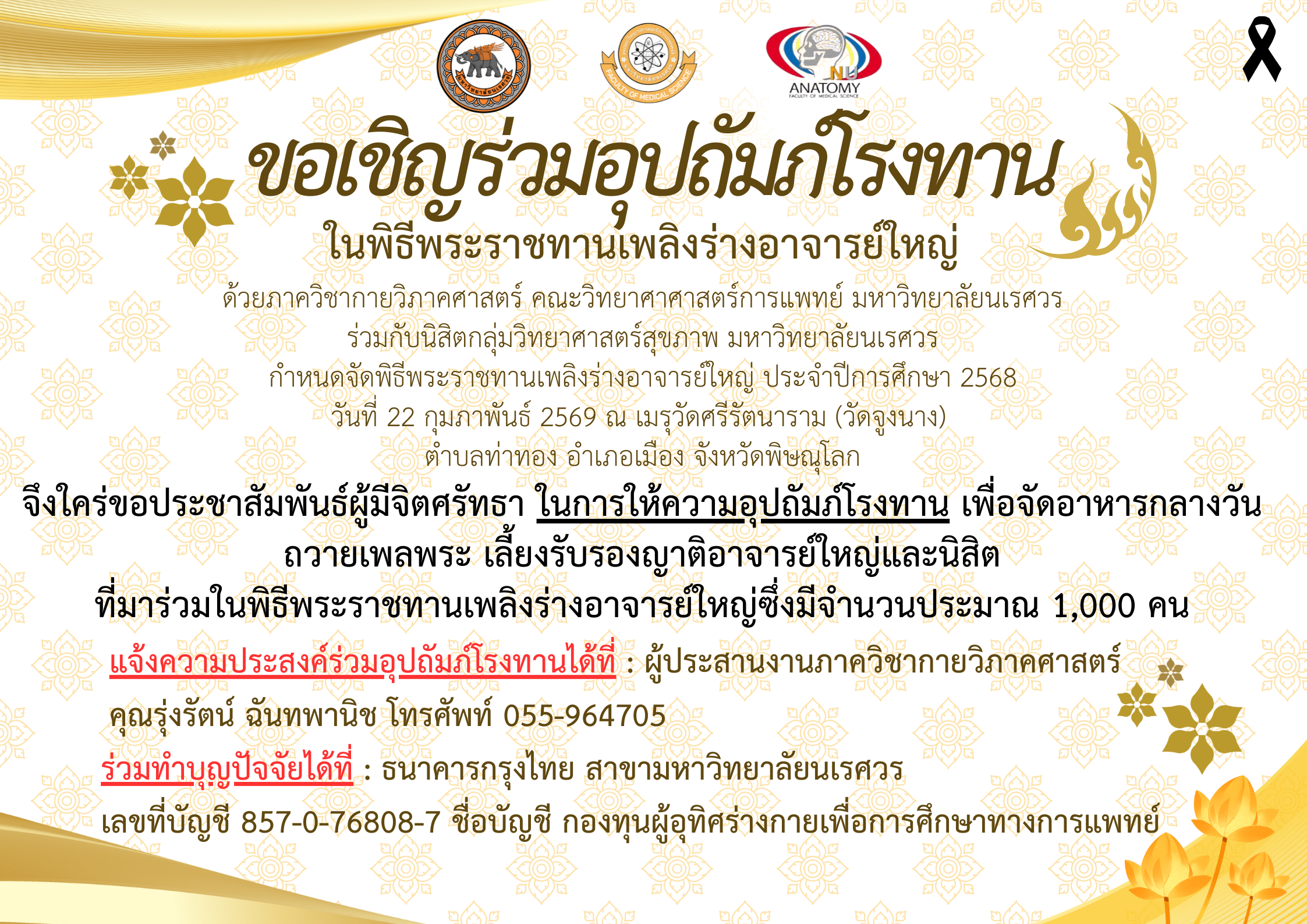 ขอเชิญชวนผู้มีจิตศรัทธาร่วมอุปภัมภ์โรงทาน ในพิธีพระราชทานเพลิงร่างอาจารย์ใหญ่ ประจำปีการศึกษา 2568