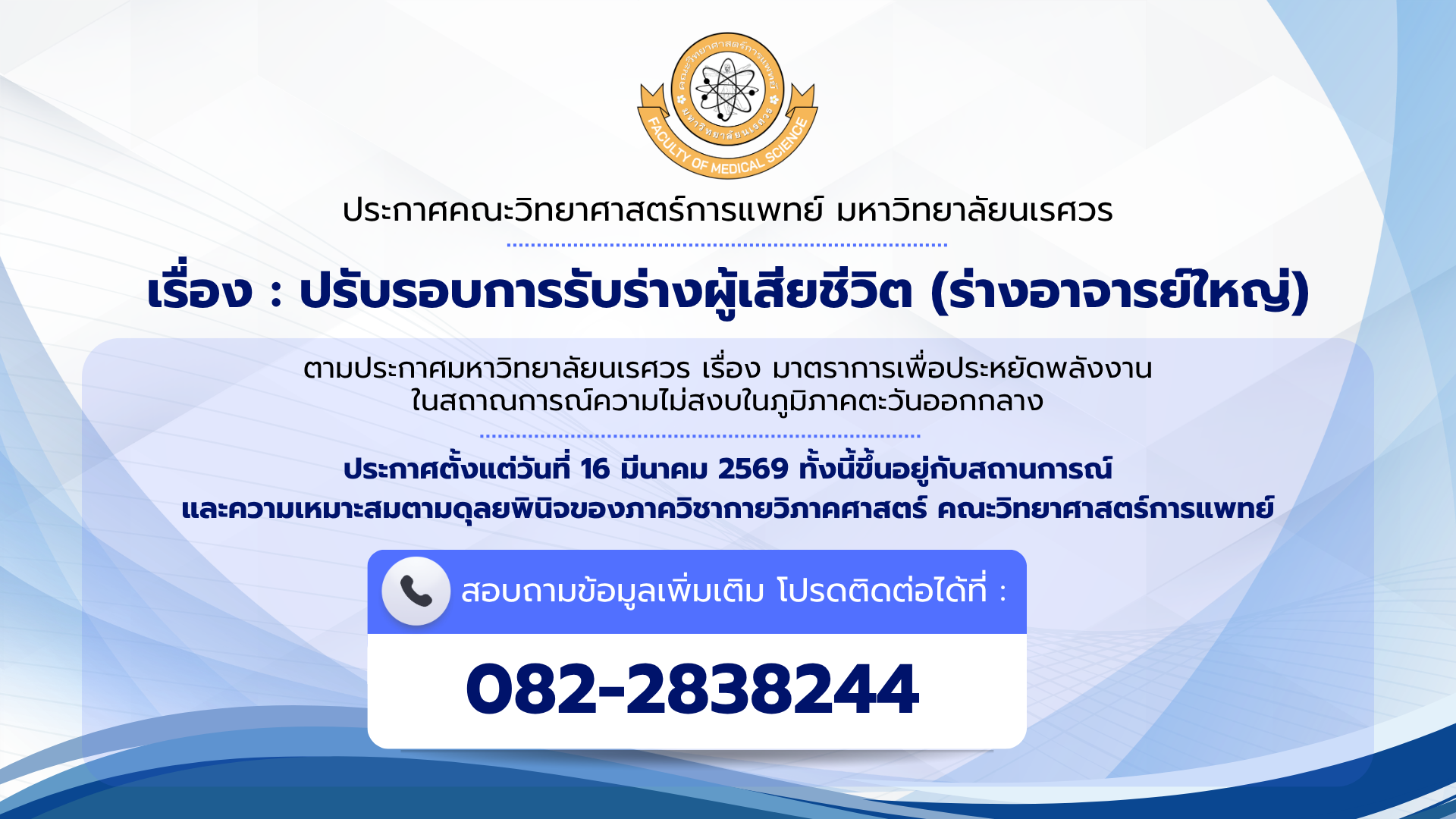 ประกาศคณะวิทยาศาสตร์การแพทย์ เรื่อง ปรับลดรอบการเดินทางไปรับร่างผู้เสียชีวิต(ร่างอาจารย์ใหญ่)ในสถานก...